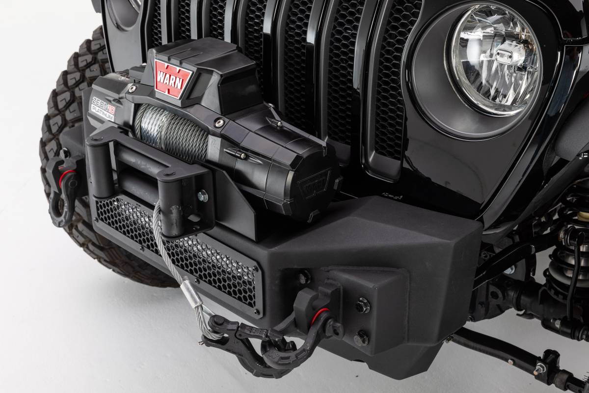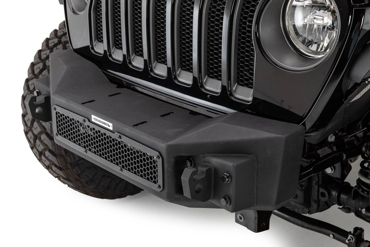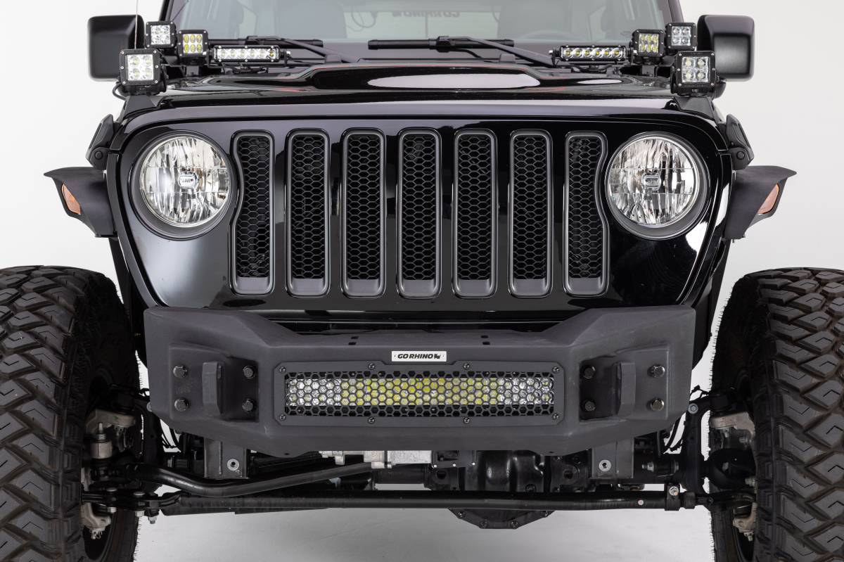 Part of Go Rhino's famous Jeep Bumper family of products. Rockline Winch Ready Front Stubby Bumper for Jeep JK, JL and JT Wrangler with signature hex mesh LED protective cover for use with either an industry standard 20" double row LED bar or up to 4 standard 3" cube lights. Rockline Bumpers come with a Limited Lifetime warranty on materials and construction and a 5 year warranty on the Textured Black finish.