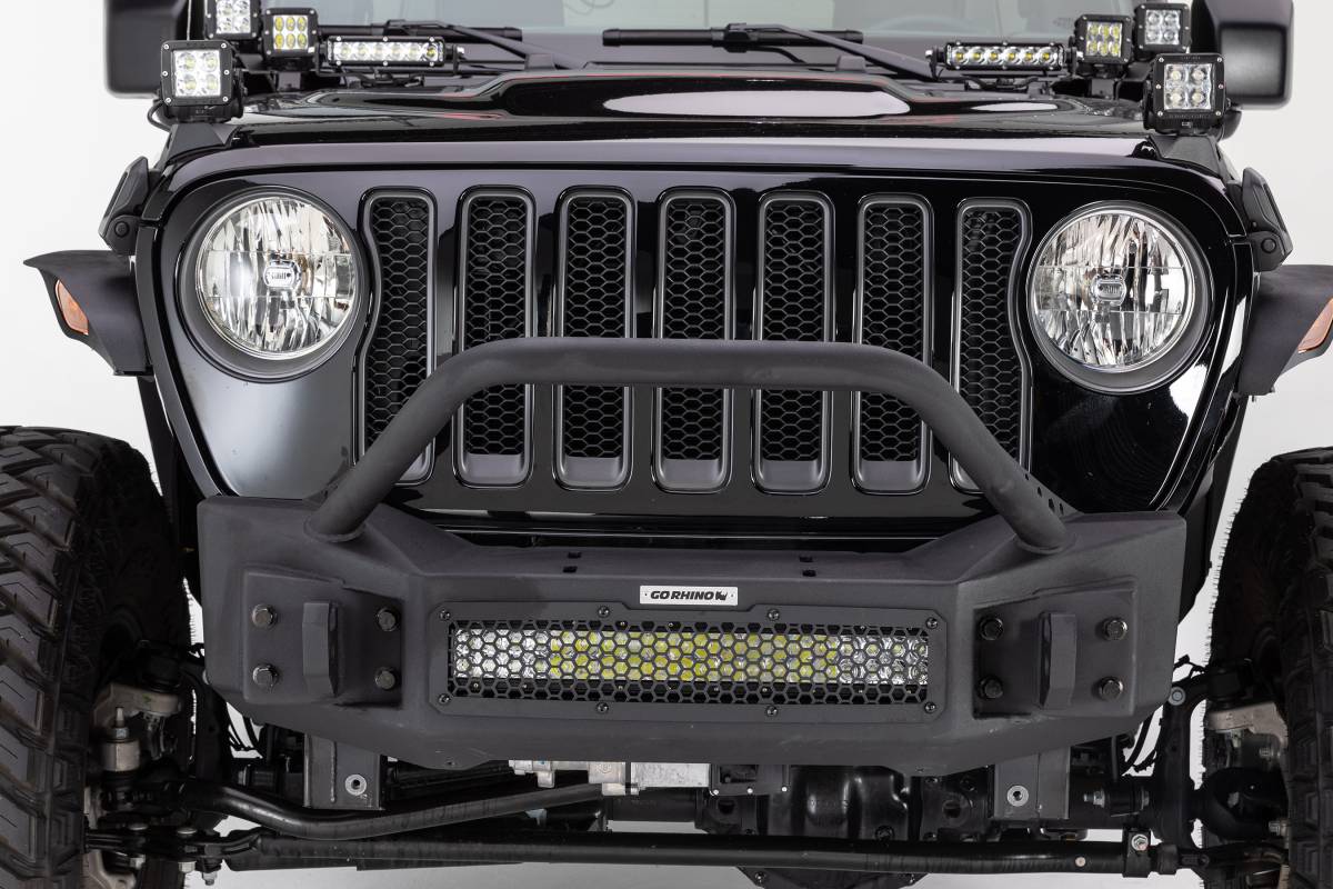 Part of Go Rhino's famous Jeep Bumper family of products. Rockline Winch Ready Front Stubby Bumper for Jeep JK, JL and JT with signature hex mesh LED protective cover for use with industry standard 20" double row LED bar or up to 4 standard 3" cube LEDs and a fully welded override light mount bar. Rockline Bumpers come with a Limited Lifetime warranty on materials and construction and a 5 year warranty on the Textured Black Finish.