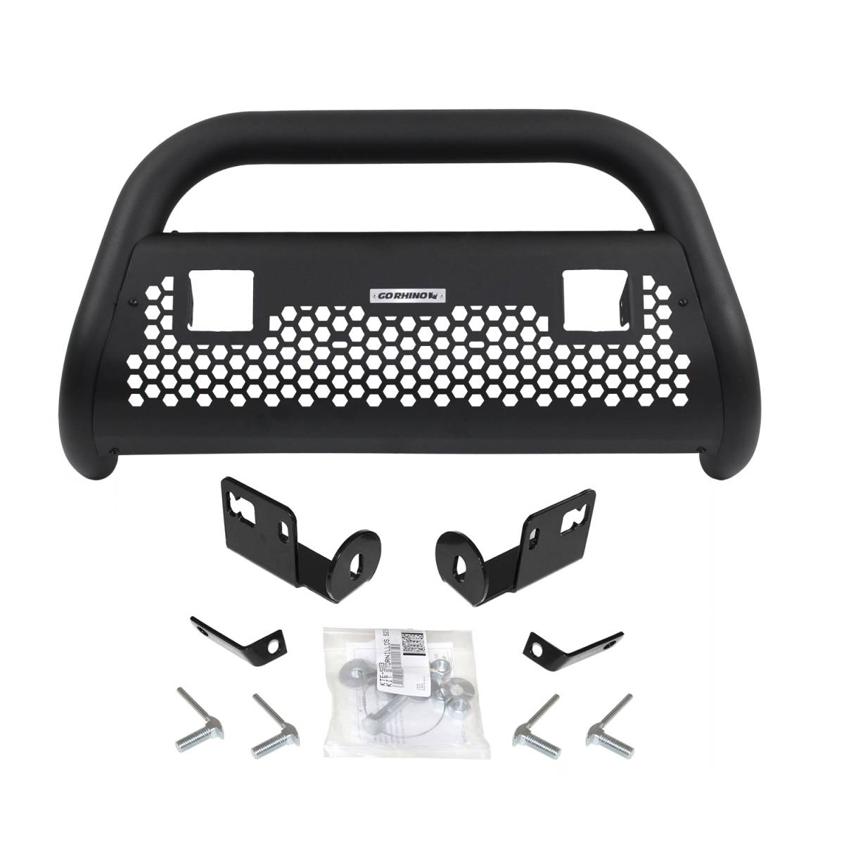 Go Rhino's RC2 LR Bull Bars offer updated styling and the ability to combine today’s popular LED lights with front-end protection. The 3" diameter tubular steel frame features a galvanized steel skid plate with a stylish hexagonal cut out pattern. Different styles are available with light mounts for one 20" single row light bar, two 3" cube lights or four 3" cube lights. In addition, all RC2 LR Bull Bars have pre-drilled light mount holes across the center crossmember. The RC2 LR is available as a standalone; as a kit that includes vehicle-specific mounting brackets; or as a kit that includes both mounting brackets and LED lights. Installation is easy with no drilling required. RC2 LR Bull Bars come with a Limited Lifetime warranty on materials and construction, a 5 year warranty on the Textured Black Finish and a 1 year warranty on the electrical compoenents.