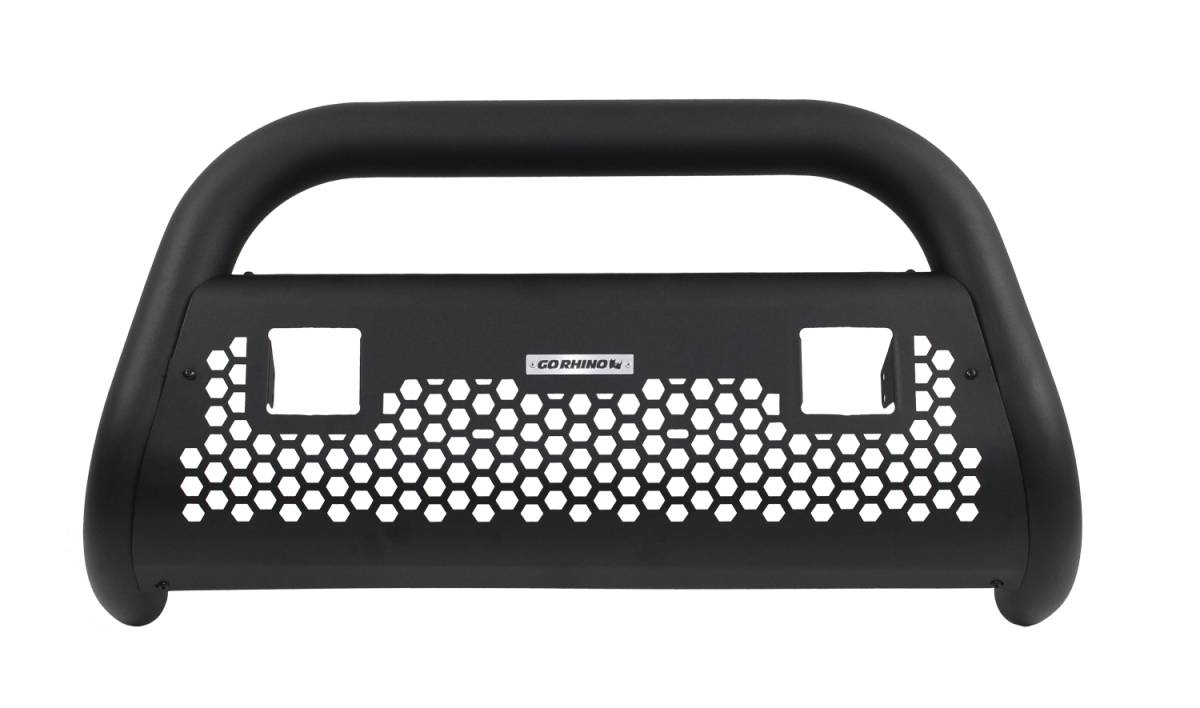 Go Rhino's RC2 LR Bull Bars offer updated styling and the ability to combine today’s popular LED lights with front-end protection. The 3" diameter tubular steel frame features a galvanized steel skid plate with a stylish hexagonal cut out pattern. Different styles are available with light mounts for one 20" single row light bar, two 3" cube lights or four 3" cube lights. In addition, all RC2 LR Bull Bars have pre-drilled light mount holes across the center crossmember. The RC2 LR is available as a standalone; as a kit that includes vehicle-specific mounting brackets; or as a kit that includes both mounting brackets and LED lights. Installation is easy with no drilling required. RC2 LR Bull Bars come with a Limited Lifetime warranty on materials and construction and a 5 year warranty on the Textured Black Finish.