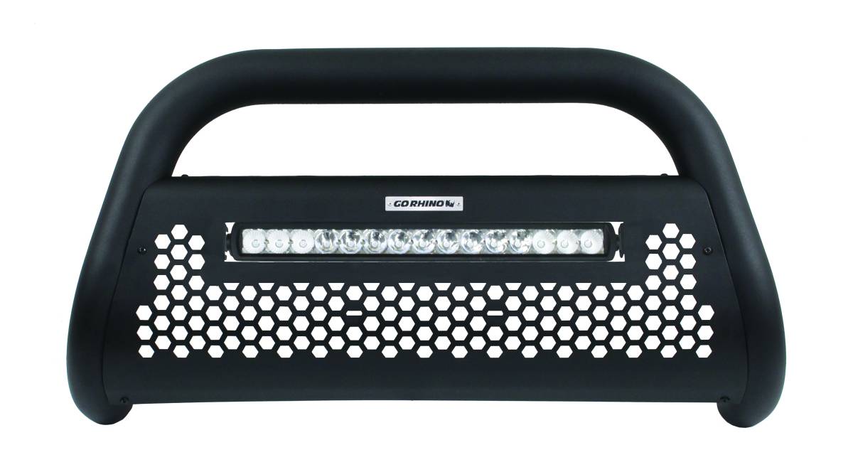 Go Rhino's RC2 LR Bull Bars offer updated styling and the ability to combine today’s popular LED lights with front-end protection. The 3" diameter tubular steel frame features a galvanized steel skid plate with a stylish hexagonal cut out pattern. Different styles are available with light mounts for one 20" single row light bar, two 3" cube lights or four 3" cube lights. In addition, all RC2 LR Bull Bars have pre-drilled light mount holes across the center crossmember. The RC2 LR is available as a standalone; as a kit that includes vehicle-specific mounting brackets; or as a kit that includes both mounting brackets and LED lights. Installation is easy with no drilling required. RC2 LR Bull Bars come with a Limited Lifetime warranty on materials and construction, a 5 year warranty on the Textured Black Finish and a 1 year warranty on the electrical compoenents.