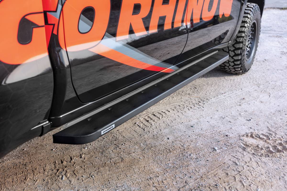 The legendary RB Series of cab length running boards from Go Rhino will make your truck, Jeep or SUV stand apart from the crowd. With an aggressive, yet stylish appearance, these bolt-on truck side steps take their visual inspiration from the Ford Raptor but are made for more than just looks. The RB10 running boards features a generous step area with Raptor-style louvers for maximum traction. The corrosion-resistant 16-gauge zinc coated steel steps are mounted high and tight, giving them plenty of clearance for off-road adventures, and are strong enough to support hundreds of pounds of weight. The welded, boxed end design is offered in textured black powder coat or rugged, bedliner coating. Hardware and brackets are included and installation on most vehicles will not require drilling. RB10 Running Board Kits come with a Limited Lifetime warranty on materials and construction and a 5 year warranty on the Textured Black Finish.
