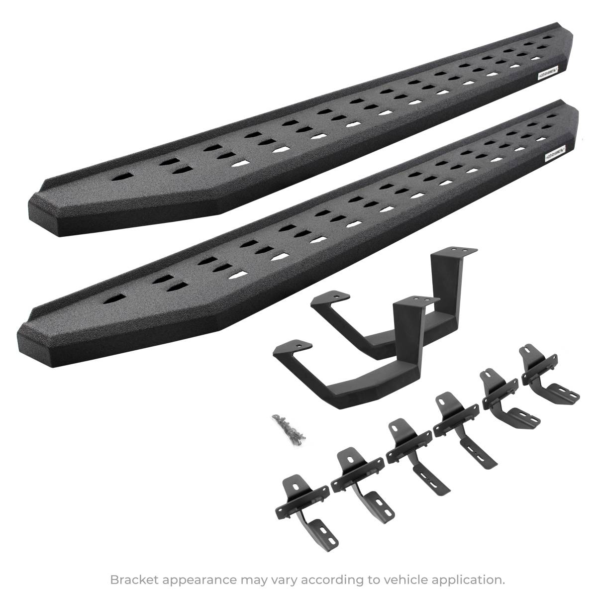 Go Rhino's legendary RB20 cab length running boards will make your truck, Jeep or SUV stand apart from the crowd. With an aggressive, yet stylish appearance, these bolt-on steps take their visual inspiration from the Ford Raptor but are made for more than just looks. The RB20's perforated holes, punched into the surface of the step, gives maximum traction and prevents mud, ice, and snow from accumulating. The corrosion-resistant 16-gauge steel steps are mounted high and tight, giving them plenty of clearance for off-roading, and are strong enough to support hundreds of pounds. The RB20 is offered in textured black powder coat or bedliner coating. Matching drop steps will make entering and exiting lifted vehicles even easier. Hardware and brackets are included. RB20 Running Boards With Drop Steps come with a Limited Lifetime warranty on materials and construction and a 5 year warranty on the Bedliner finish.