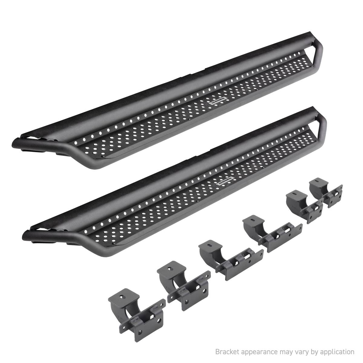 The Go Rhino Dominator D1 is a cab length slider with drop down step designed for both the daily driver and the recreational off-roader. The D1 is constructed of powder coated steel tubing that provides slider protection from trail obstacles and road debris along the rocker panel of vehicle. The wide step area and mesh stepping plate allows for easy access in and out of a lifted vehicle and the raised hex pattern offers a no-slip grip. Installation is easy and the utilization of the OEM step mount locations means no drilling or cutting required. Hardware and brackets are included. The D1 Side Steps come with a Limited Lifetime warranty on materials and construction and a 5 year warranty on the Textured Black Finish.