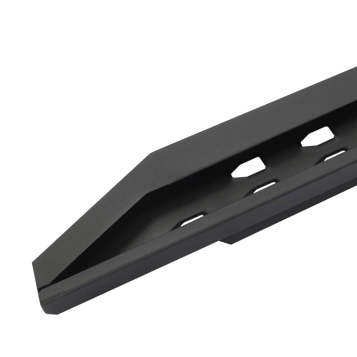 The RB20 Slim Line Running Boards offer the same heavy duty toughness as the original RB Series, but with a slimmer design that fits tighter along the cab for increased ground clearance when off-roading. Constructed from 16-gauge zinc-coated galvanized steel, the Raptor-inspired boards were built to protect your panels from flying debris while providing a full-length step platform. The modern, bullet-stamped design is 5 1/2 inches across at its widest point (compared with 7 1/2 inches of the original RB20) and are offered in cab-length sizes that fit most popular trucks, Jeeps and SUVs. RB20 Slims Boards come with a Limited Lifetime warranty on materials and construction and a 5 year warranty on the Textured Black Finish.
