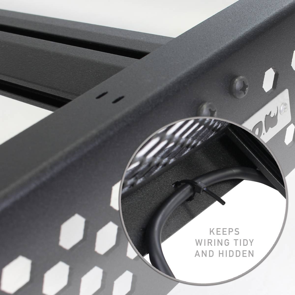 The CEROS Low Profile Aluminum Roof Rack brings cutting edge style and practicality to your truck. The aerodynamic, low profile design contours the vehicle roof’s curves with application-specific fit. The CEROS utilizes Go Rhino’s exclusive 4-CORE crossbars, an extruded track system that can work with any 1/4-20 hex bolt and offers unlimited mounting options for accessories, gear and tools. The frontmost crossbar supports the front fairing and can be used to mount light bars or multiple cube lights. The dropped edge of the fairing allows a single row light bar to remain flush with the frame’s topline, maintaining the sleek, streamlined look. (Note: Lights sold separately.) CEROS Racks come with a Limited Lifetime warranty on materials and construction and a 5 year warranty on the Textured Black Finish.