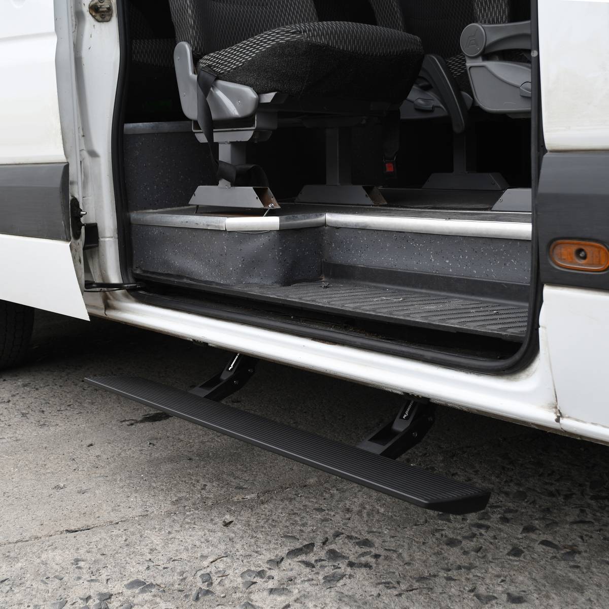 Go Rhino’s retractable E1 Electric Running Boards model #20410125PC allow you to step in and out of your Mercedes-Benz Sprinter van with ease. Open your van door and the E1 electric powered steps automatically deploy, providing a secure 6" wide durable aluminum running board with an anti-slip stepping surface. For additional safety and security, the powered side steps are equipped with integrated LED lights that turn on automatically when the running boards/side steps deploy. Close your Mercedes-Benz Sprinter door and the E1 running boards automatically retract, providing your van vehicle with optimal ground clearance and protection for its rocker panel while preserving the look of your Mercedes-Benz Sprinter. The E1's retractable running boards are equipped with dual electric powered motors on each running board/step. The Go Rhino E1 Electric Running Boards are reliable even in extreme climates and weather conditions. The easy-to-install, magnetically-activated door switches leave your OBD port free for other accessories. Automatic safety stop and manual override capabilities of the powered side steps are included. The model #20410125PC E1 electric powered steps are finished with a textured black powder coat and have black nylon step end caps. The E1 Electric Running Boards come as a complete kit with a Limited Lifetime warranty on materials and construction and a 5 year warranty on the powered step's Textured Black Powder Coat finish.