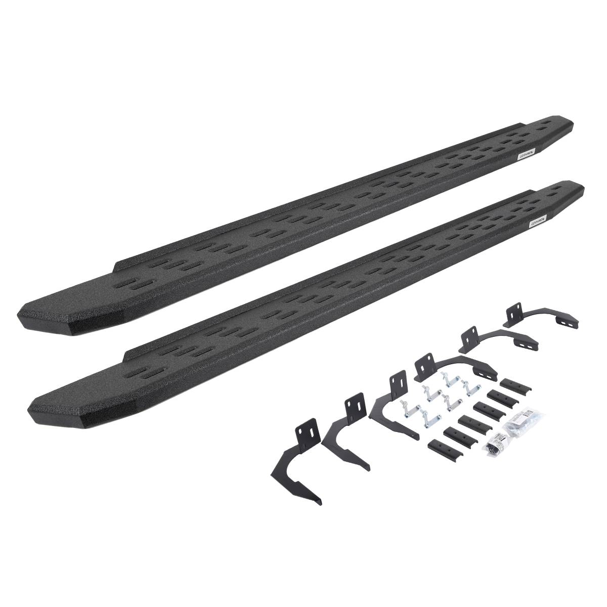 Meet the third edition of the legendary Go Rhino RB Series of running boards: the RB30. The RB30 is the next generation of Raptor-inspired design that will make your truck, Jeep, Bronco or SUV stand out from the crowd. With its aggressive, stylish appearance, this cab-length, bolt-on side step provides maximum traction and features an open flow-through design that prevents mud, ice, and snow from accumulating. The corrosion-resistant 16-gauge steel step mounts tightly to factory mounting points along the lower rocker panel, providing plenty of clearance for off-roading, and it’s strong enough to support 300 lbs. per stepping surface for 600 lbs. per board. The RB30 Running Board is 7” wide for most its length before it tapers (compared to 5” wide for the Slim Line version). All RB Series Running Boards are available in Textured Black Powder Coat or Protective Bedliner finish, made in North America and offer a limited lifetime warranty against manufacturer and material defects, with a 5-year warranty on the finish.