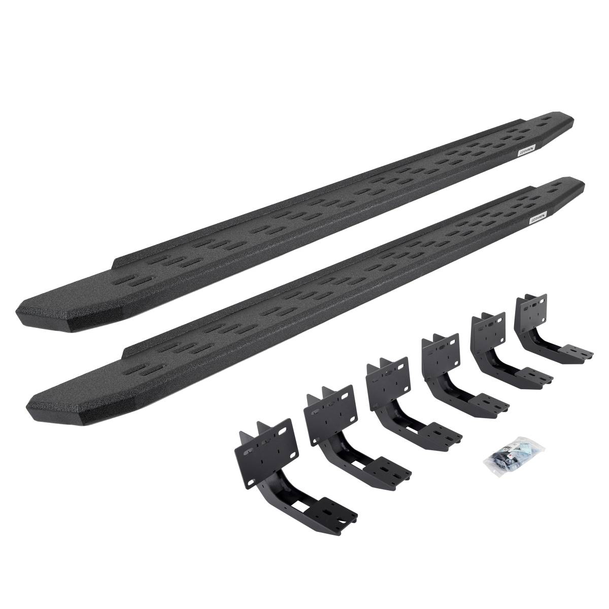 Meet the third edition of the legendary Go Rhino RB Series of running boards: the RB30. The RB30 is the next generation of Raptor-inspired design that will make your truck, Jeep, Bronco or SUV stand out from the crowd. With its aggressive, stylish appearance, this cab-length, bolt-on side step provides maximum traction and features an open flow-through design that prevents mud, ice, and snow from accumulating. The corrosion-resistant 16-gauge steel step mounts tightly to factory mounting points along the lower rocker panel, providing plenty of clearance for off-roading, and it’s strong enough to support 300 lbs. per stepping surface for 600 lbs. per board. The RB30 Running Board is 7” wide for most its length before it tapers (compared to 5” wide for the Slim Line version). All RB Series Running Boards are available in Textured Black Powder Coat or Protective Bedliner finish, made in North America and offer a limited lifetime warranty against manufacturer and material defects, with a 5-year warranty on the finish.