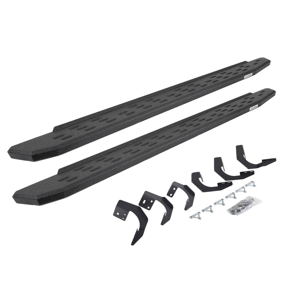 Meet the third edition of the legendary Go Rhino RB Series of running boards: the RB30. The RB30 is the next generation of Raptor-inspired design that will make your truck, Jeep, Bronco or SUV stand out from the crowd. With its aggressive, stylish appearance, this cab-length, bolt-on side step provides maximum traction and features an open flow-through design that prevents mud, ice, and snow from accumulating. The corrosion-resistant 16-gauge steel step mounts tightly to factory mounting points along the lower rocker panel, providing plenty of clearance for off-roading, and it’s strong enough to support 300 lbs. per stepping surface for 600 lbs. per board. The RB30 Running Board is 7” wide for most its length before it tapers (compared to 5” wide for the Slim Line version). All RB Series Running Boards are available in Textured Black Powder Coat or Protective Bedliner finish, made in North America and offer a limited lifetime warranty against manufacturer and material defects, with a 5-year warranty on the finish.
