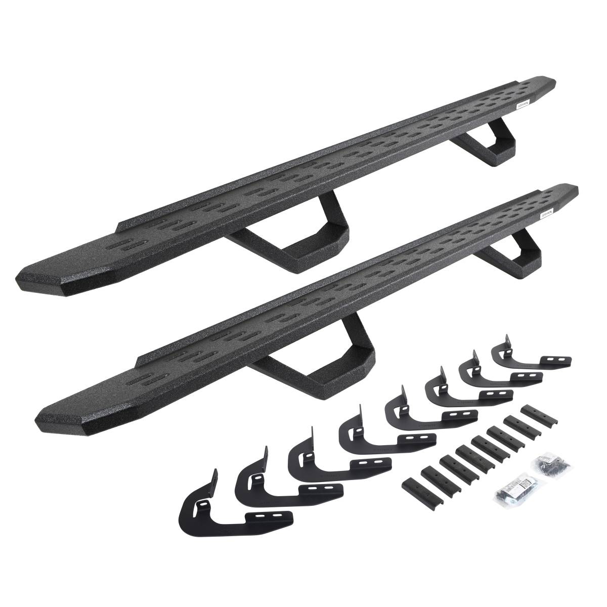 Meet the third edition of the legendary Go Rhino RB Series of running boards: the RB30. The RB30 is the next generation of Raptor-inspired design that will make your truck, Jeep, Bronco or SUV stand out from the crowd. With its aggressive, stylish appearance, this cab-length, bolt-on side step provides maximum traction and features an open flow-through design that prevents mud, ice, and snow from accumulating. The corrosion-resistant 16-gauge steel step mounts tightly to factory mounting points along the lower rocker panel, providing plenty of clearance for off-roading, and it’s strong enough to support 300 lbs. per stepping surface for 600 lbs. per board. Matching drop steps will make entering and exiting lifted vehicles even easier. The RB30 Running Board is 7” wide for most its length before it tapers (compared to 5” wide for the Slim Line version). All RB Series Running Boards are available in Textured Black Powder Coat or Protective Bedliner finish, made in North America and offer a limited lifetime warranty against manufacturer and material defects, with a 5-year warranty on the finish.