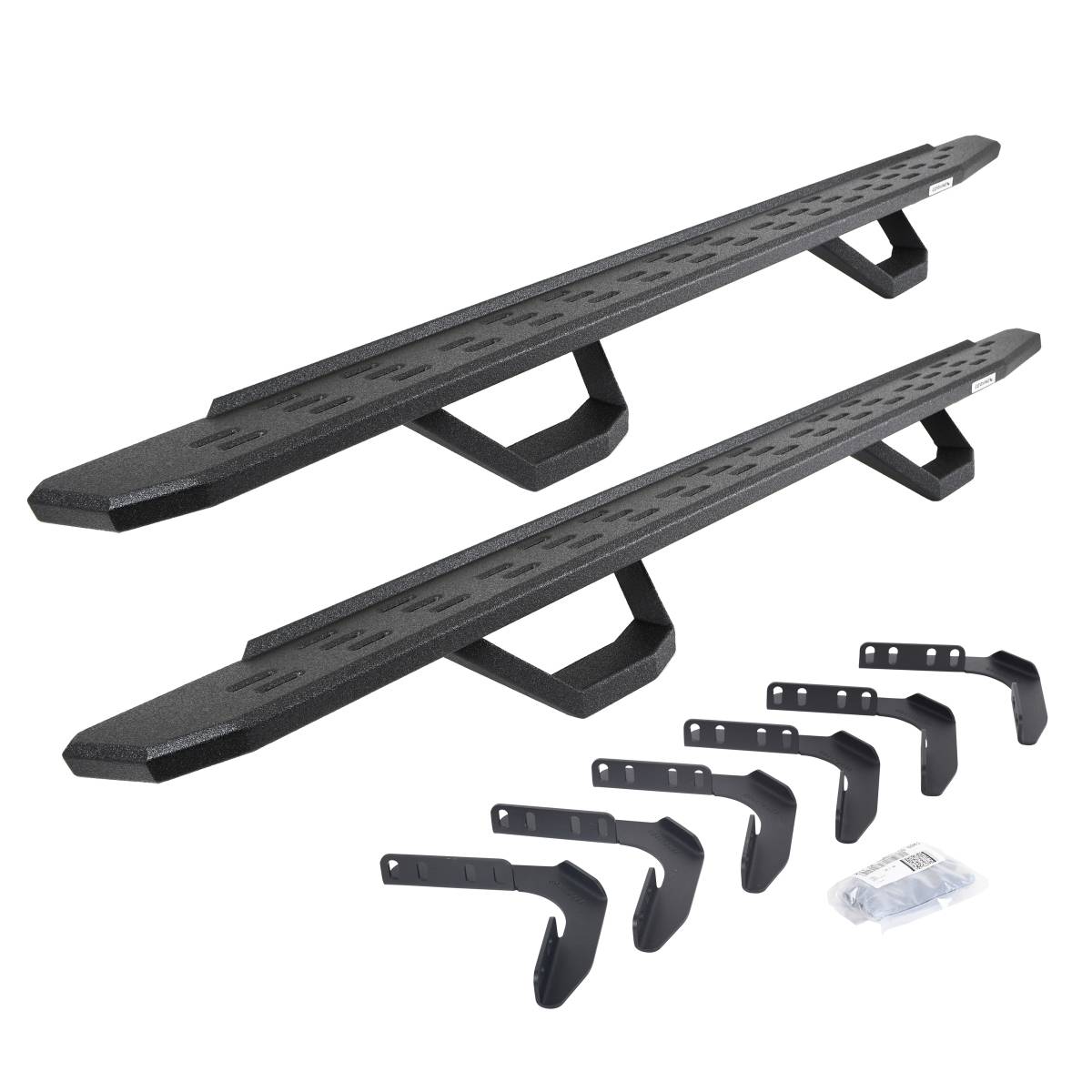 Meet the third edition of the legendary Go Rhino RB Series of running boards: the RB30. The RB30 is the next generation of Raptor-inspired design that will make your truck, Jeep, Bronco or SUV stand out from the crowd. With its aggressive, stylish appearance, this cab-length, bolt-on side step provides maximum traction and features an open flow-through design that prevents mud, ice, and snow from accumulating. The corrosion-resistant 16-gauge steel step mounts tightly to factory mounting points along the lower rocker panel, providing plenty of clearance for off-roading, and it’s strong enough to support 300 lbs. per stepping surface for 600 lbs. per board. Matching drop steps will make entering and exiting lifted vehicles even easier. The RB30 Running Board is 7” wide for most its length before it tapers (compared to 5” wide for the Slim Line version). All RB Series Running Boards are available in Textured Black Powder Coat or Protective Bedliner finish, made in North America and offer a limited lifetime warranty against manufacturer and material defects, with a 5-year warranty on the finish.