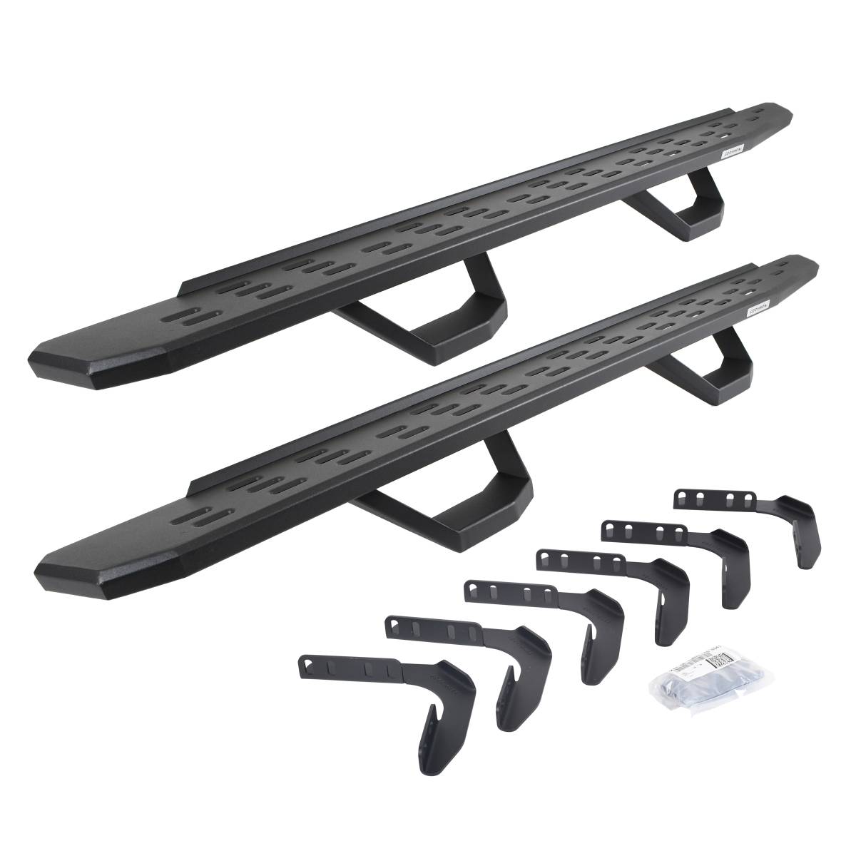 Meet the third edition of the legendary Go Rhino RB Series of running boards: the RB30. The RB30 is the next generation of Raptor-inspired design that will make your truck, Jeep, Bronco or SUV stand out from the crowd. With its aggressive, stylish appearance, this cab-length, bolt-on side step provides maximum traction and features an open flow-through design that prevents mud, ice, and snow from accumulating. The corrosion-resistant 16-gauge steel step mounts tightly to factory mounting points along the lower rocker panel, providing plenty of clearance for off-roading, and it’s strong enough to support 300 lbs. per stepping surface for 600 lbs. per board. Matching drop steps will make entering and exiting lifted vehicles even easier. The RB30 Running Board is 7” wide for most its length before it tapers (compared to 5” wide for the Slim Line version). All RB Series Running Boards are available in Textured Black Powder Coat or Protective Bedliner finish, made in North America and offer a limited lifetime warranty against manufacturer and material defects, with a 5-year warranty on the finish.