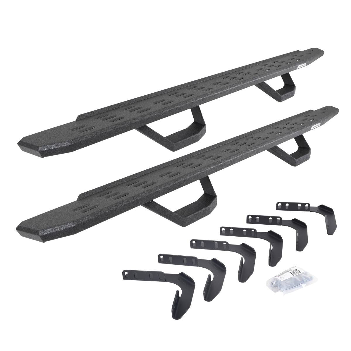 Meet the third edition of the legendary Go Rhino RB Series of running boards: the RB30. The RB30 is the next generation of Raptor-inspired design that will make your truck, Jeep, Bronco or SUV stand out from the crowd. With its aggressive, stylish appearance, this cab-length, bolt-on side step provides maximum traction and features an open flow-through design that prevents mud, ice, and snow from accumulating. The corrosion-resistant 16-gauge steel step mounts tightly to factory mounting points along the lower rocker panel, providing plenty of clearance for off-roading, and it’s strong enough to support 300 lbs. per stepping surface for 600 lbs. per board. Matching drop steps will make entering and exiting lifted vehicles even easier. The RB30 Running Board is 7” wide for most its length before it tapers (compared to 5” wide for the Slim Line version). All RB Series Running Boards are available in Textured Black Powder Coat or Protective Bedliner finish, made in North America and offer a limited lifetime warranty against manufacturer and material defects, with a 5-year warranty on the finish.