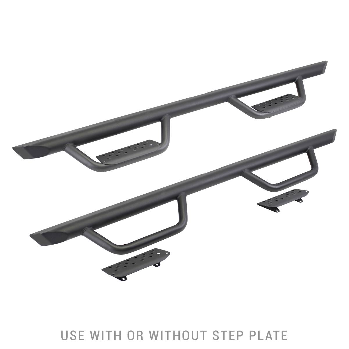 The Go Rhino Dominator Xtreme D2 combines the good looks and cool factor of the drop step design with the functionality of a traditional OE oval side step. The one-piece main bar is constructed of heavy duty steel tubing with the two welded hoops strategically placed beneath each door. The punched steel step pads offer no-slip grip in wet or muddy conditions and make entry and exiting a lifted vehicle easy. Installation is easy and the utilization of the OEM step mount locations means no drilling or cutting required. Hardware and brackets are included. The Xtreme D2 Side Steps come with a Limited Lifetime warranty on materials and construction and a 5 year warranty on the Textured Black Finish.