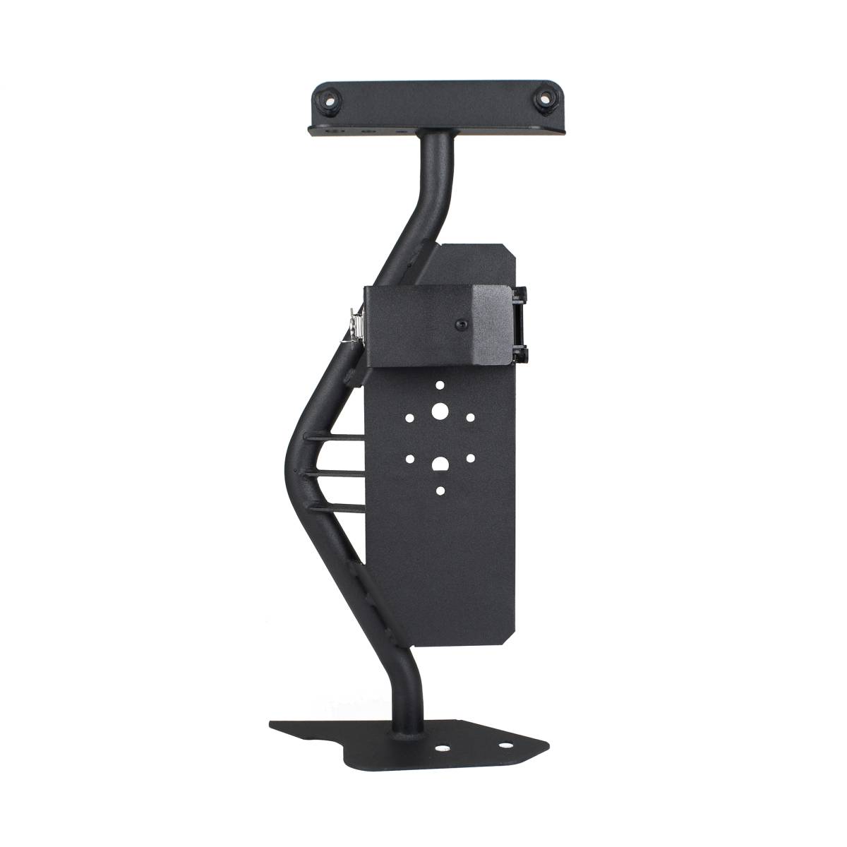 Front driver side exterior jack mount for Jeep Wrangler JL and JLU - mounts high clearance off-road and farm jacks securely to side of vehicle. Unique design keeps jack from rattling while driving. Easy no drill installation. The Jack Mount comes with a Limited Lifetime warranty on materials and construction and a 5 year warranty on the the textured black finish.