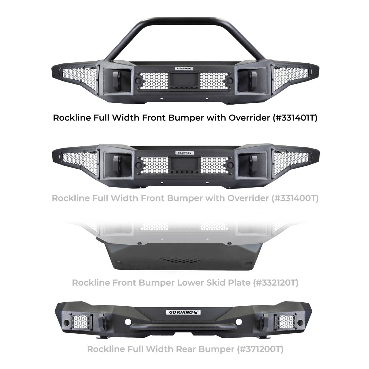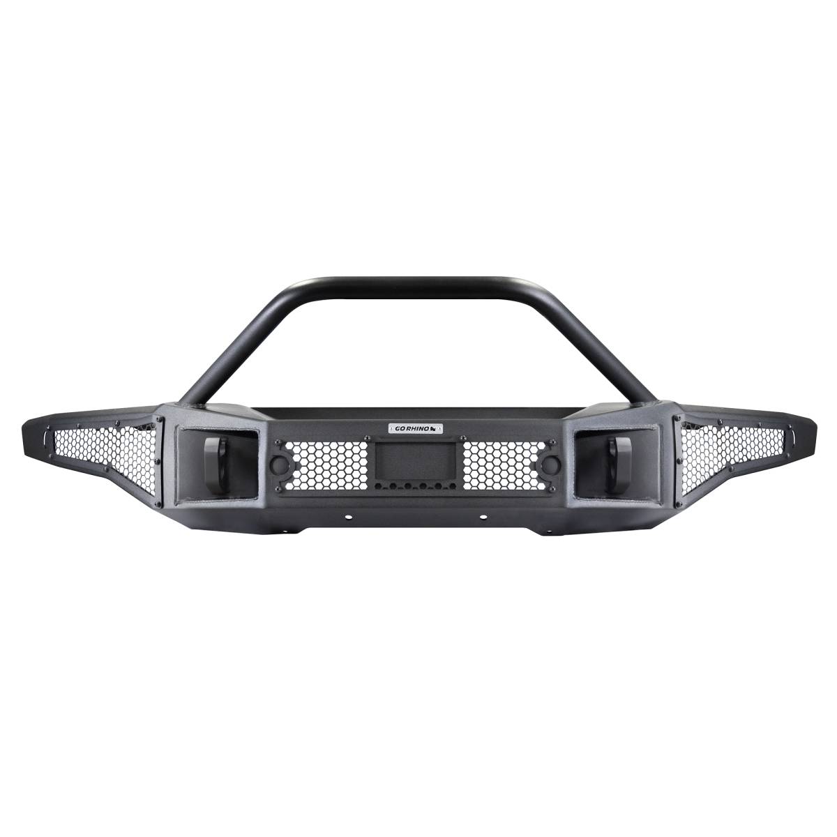 Part of Go Rhino's famous Bumper family of products. Rockline Winch Ready Front Full Width Bumper for Ford Bronco with signature hex mesh LED protective cover for use with industry standard 20" double row LED bar or up to 4 standard 3" cube LEDs and a fully welded override light mount bar. Rockline Bumpers come with a Limited Lifetime warranty on materials and construction and a 5 year warranty on the Textured Black Finish.