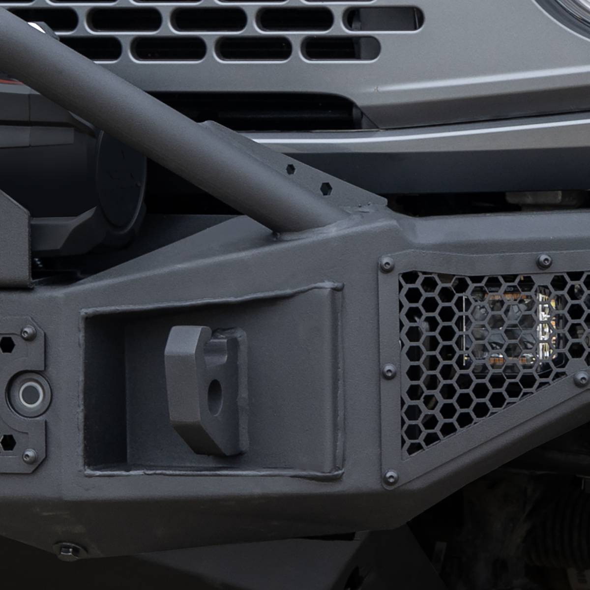 Rockline Winch Ready Front Stubby Bumper for Ford Bronco with signature hex mesh LED protective cover for use with industry standard 20" double row LED bar or up to 4 standard 3" cube LED's & a fully welded over rider light mount bar