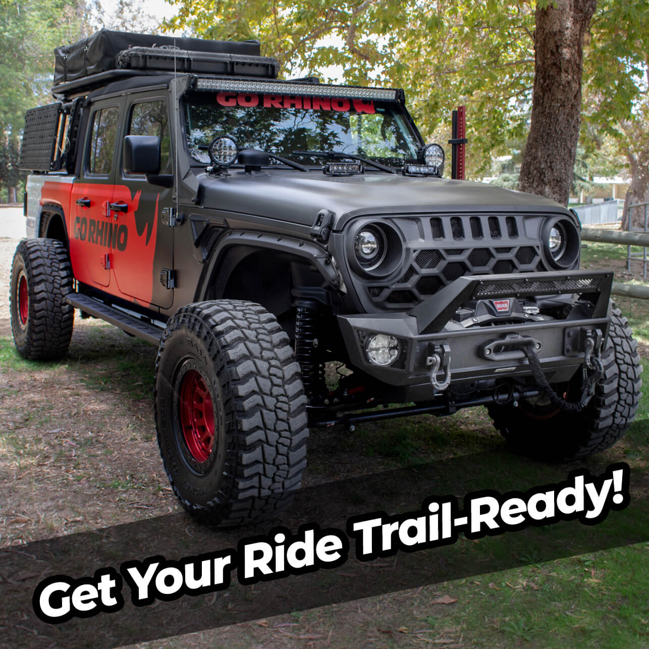 Go Rhino has your Jeep covered on your next overland or off-road adventure. Aside from a wide assortment of running boards, side steps and roof racks tailor-made to fit your Jeep, Go Rhino has taken the extra step of providing accessories unique to your Wrangler or Gladiator. Choose from a wide selection of Jeep-specific Bumpers, Roof Racks, Rock Sliders, Tube Doors and Lighting accessories to not only increase your outdoor enjoyment but upgrade the look of your Wrangler or Gladiator.